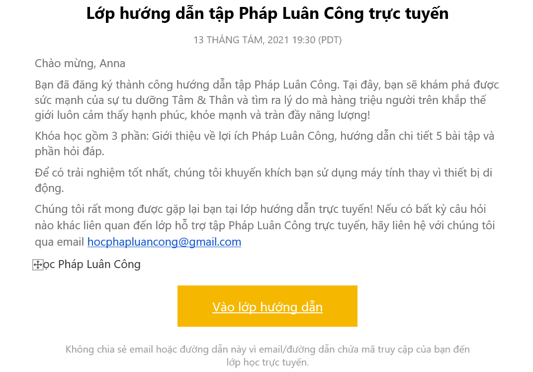 Bạn sẽ nhận được một email xác nhận, sau khi đã đăng ký tham gia lớp hướng dẫn tập Pháp Luân Công trực