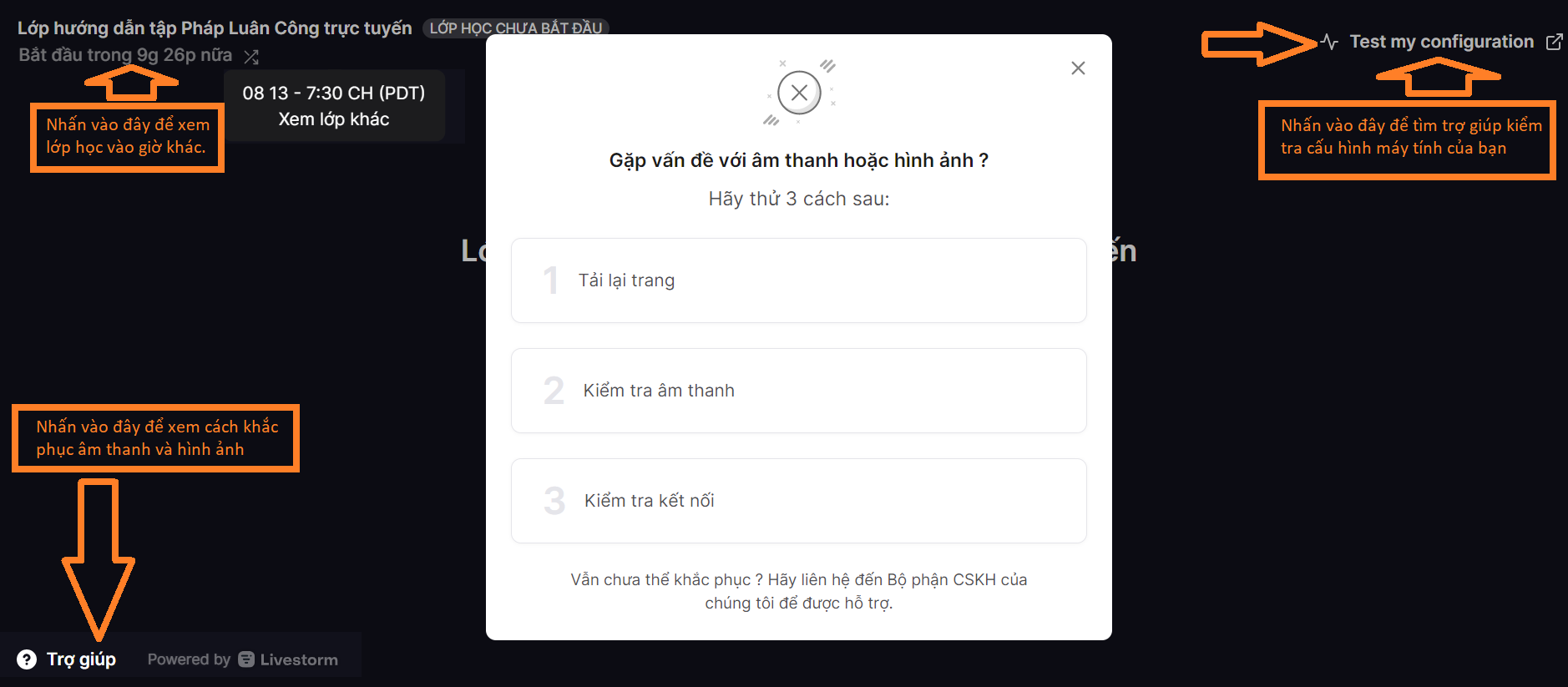 Khi đã vào được lớp học bạn có thể , click "Trợ giúp" hoặc "Các vấn đề gặp phải với âm thanh